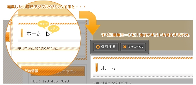 ホームページの編集したい場所でダブルクリックすると、即座に編集モードに変わります。